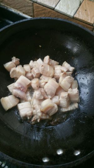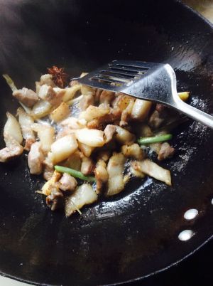 肉放锅里煸炒出油,加姜片,蒜白,大料炒香