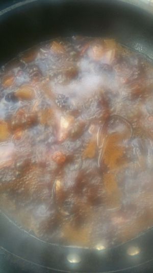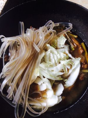 啤酒收汤少的时候,倒入开水,继续煮,放入腐卤,继续收汤,汤到一半的时候,放入寬粉条,继续煮!汤收的快没时,再倒入适量开水煮,直到把粉煮烂,猪肉适量软糯为止,出锅!