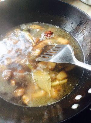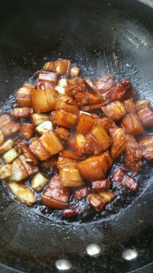 煸炒到金黄倒入黄酒,红烧酱油,放入葱,姜蒜,不停煸炒,看颜色差不多,再倒入一罐啤酒!