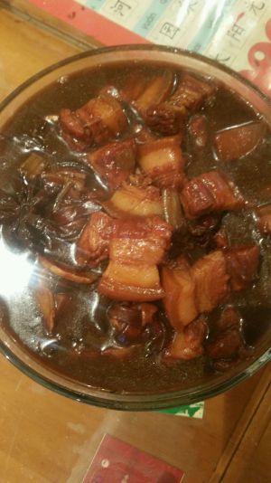 锅烧热放少量油,加入猪肉翻炒至发白,加入老抽炒匀至上色添水开始炖,同时放入大料,花椒,葱段,干红辣椒,姜片。开锅后小火慢炖半个小时后放入盐。