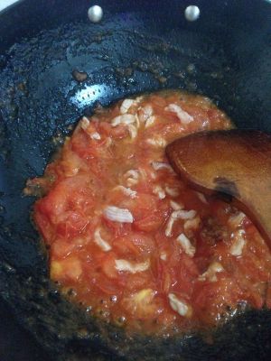 鸡蛋与西红柿酱汁一起翻炒(如果盖浇面的话这步只要加入适量盐把它浇到煮好的面条上即可食用了)