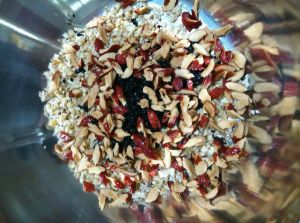 把核桃和腰果放到塑料袋里,用擀面杖轻轻压碎,或者用刀切碎,我两种方法都用过,个人觉得刀切好一点,塑料袋下图小心要破,尽量碎一点。红枣,用剪刀剪小!不用去核再剪,直接剪,剪的时候避开核就行了,我买的新疆灰枣,这个枣肉厚一点,香甜一点,核也比较小,其他枣也可以用。
