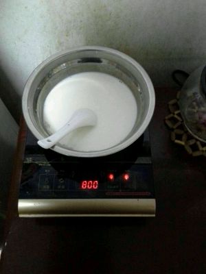 水牛奶煮沸腾,加入适量白糖。我只加一勺。