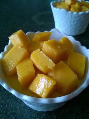 芒果切成块状,(预留大约1/4部分)其他放入料理机