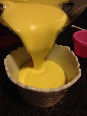 将蛋黄泥与芒果泥与打发的淡奶油混合在一起,打顺。(不要打太久,打到看到顺就可以)放冰箱冰4小时左右。实际上要看装雪糕的溶器大小,反正看到结了就可以了。