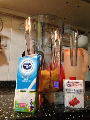 将500ml牛奶放入锅中,加入适量的白砂糖,煮大概十分钟。糖的分量可以根据个人口味添加。尝一口牛奶就知道是不是够啦。 喜欢甜食的就多加一点。芒果本身很甜,我就加了一勺。这里忘记拍照片了,不过很简单,没照片也ok。