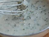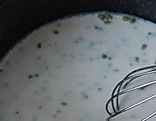 绿豆加水大火熬开,小火煮至出沙,把漂浮的绿豆皮捞出来不要,加入冰糖和剩余的牛奶。冰糖融化后加入拌匀的糯米粉。