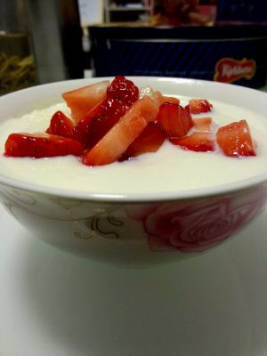 等到双皮奶蒸好后,淋上自制的草莓酱或者自己喜欢吃的水果就可以啦
