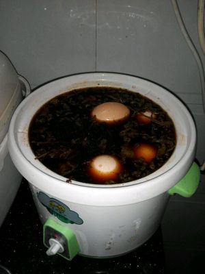鸡蛋用匙羹敲裂,另外准备味料(我用bb的電粥煲做的)三匙蚝油,¾生抽,适量盐,一匙砂糖,一块果皮,适量胡椒粉(剛好有这个,就代替了那些香料了),适量水,一包铁观音,确保能没过鸡蛋,開始煮吧