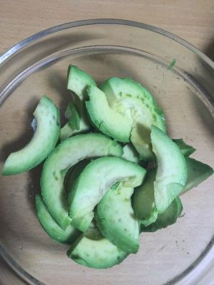 把切好片的蛋倒入牛油果的碗中,浇上色拉酱,根据嗜好添加用量