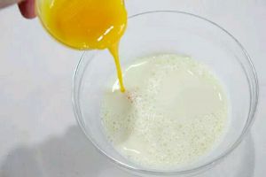 倒入调制好的牛奶蛋黄液中,少量多次倒,边倒边搅拌。