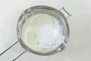 2.淡奶油,牛奶,糖粉和炼乳一起加热化炼乳和糖粉,放置冷却。