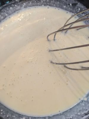加入160克纯牛奶,快速搅拌均匀。这样我们的挞液就完成了。