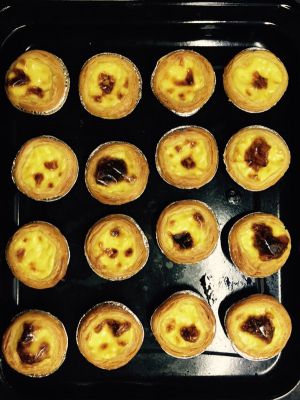 烤箱预热10分钟,中层 190度20分钟左右,观察蛋挞上色,有焦化基本上就ok了。(每个人的烤箱不一样,注意观察)