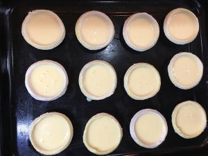将蛋挞液放入解冻好的蛋挞皮内,放至8到9分满,送入烤箱。