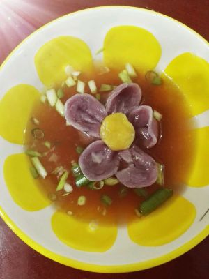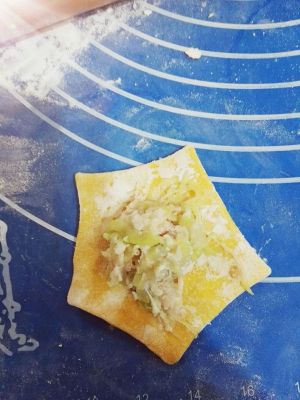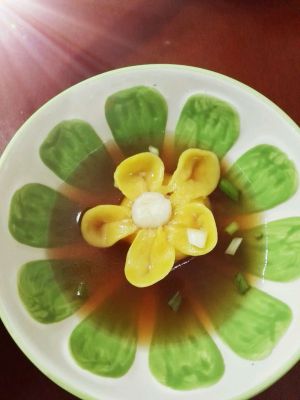成品图。外面买的饺子皮比较干,建议备好汤。也可以用大馄饨皮来做。