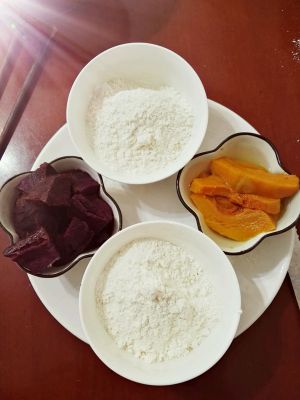 和面(用蒸好紫薯,南瓜里热水一起和)静置半小时