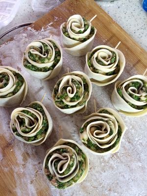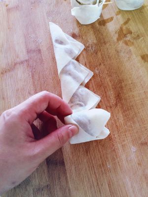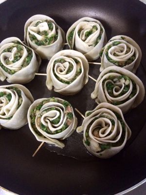 饺子皮卷起来,用牙签固定最好的尾巴。饺子皮版忘记拍照了,附上馄饨皮版的照片。如果用馄饨皮,最好是大馄饨皮,小馄饨皮太薄了,煎煮的时候容易破。