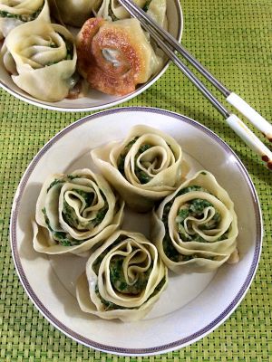 做好的玫瑰花饺子摆入蒸盘,送入蒸烤箱,调蒸功能,时间15分钟。