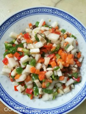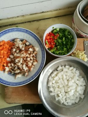 各种材料全部切丁,年糕丁煮软或用热水泡软备用,瘦肉用淀粉、料酒抓匀备用