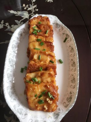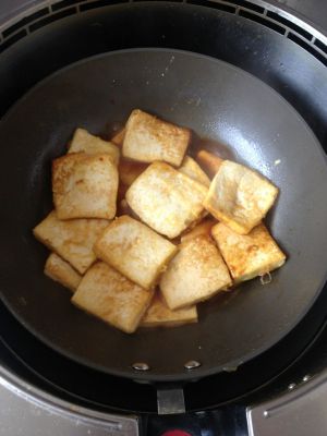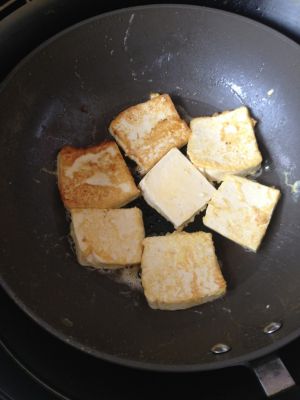 把酱汁浇在煎好的豆腐上,加水小火慢炖,待汤汁收浓