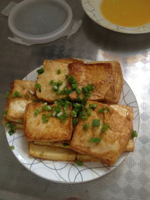 平底锅烧热注油(油量略多些),五成油温时将裹了蛋液的豆腐排入锅中,煎至底面金黄凝固时翻个面,将豆腐两面翻煎至焦香时盛出,用吸油纸吸去多余的油分。