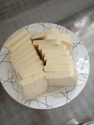 将豆腐顺着长度,切成厚度约1.5cm的长方形豆腐块。