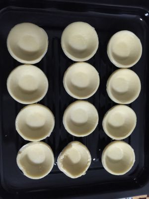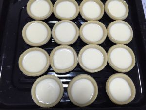 蛋挞皮解冻15分钟后,将蛋挞水灌入,大约8,9分''满即可。