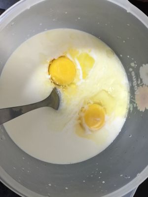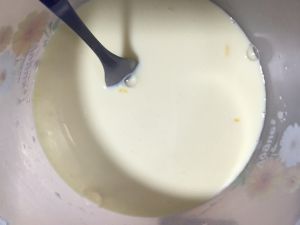 将牛奶,炼奶和鸡蛋一起打均匀。