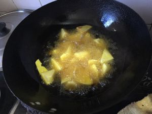 锅做油 地瓜炸至金黄的 最好是硬壳了 捞出