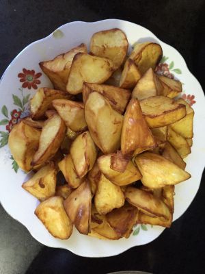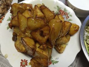 出锅了,盘子里有油这样地瓜就不会沾到上面。