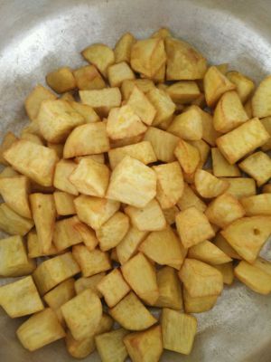 锅内放油开小火使油温到120摄氏度,放入地瓜炸8分钟左右,捞出备用。