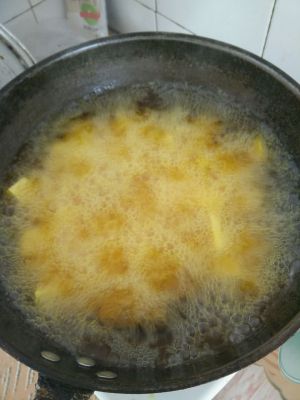 然后放入地瓜块炸至金黄色捞出