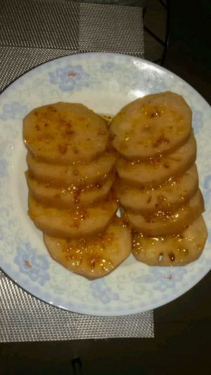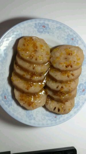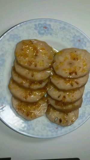 烹饪结束,取出莲藕,放凉后切片装盘,淋上糖桂花即可食用。