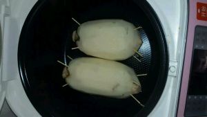 洗净。剥皮。一头切开灌进事先泡了一夜的糯米。用筷子辅助塞满。然后盖住用牙签固定好。