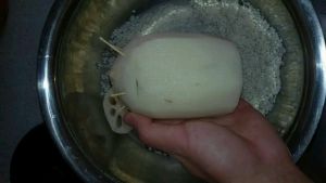 将沥干水分的糯米灌入藕孔中,压实,切开的藕盖也封口,用牙签固定。