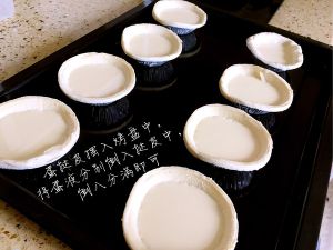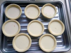 蛋挞皮摆入烤盘中,分别倒入挞皮中,倒入八分满即可
