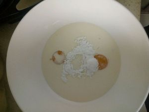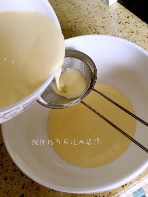 把打散的蛋黄倒入冷却的牛奶液中,依次加入淡奶油、盐,面粉过筛倒入。有炼乳的加10g炼乳(我没有就没加)。