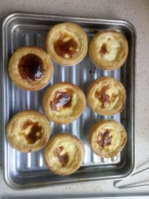 把提前拿出来解冻的塔皮(据说是全网最低价,某宝买的,相当于快四毛钱一个买的,确实酥脆)一半放葡萄干,放了葡萄干的葡式蛋挞,9个放9个没放。
