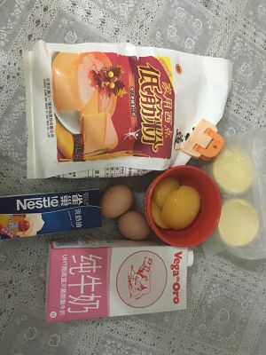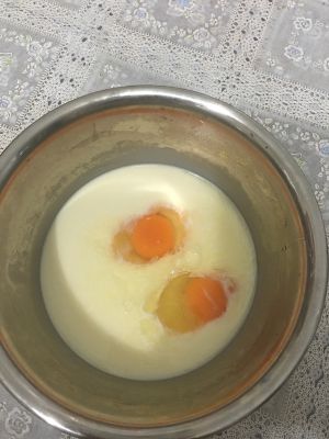 第二步 将2个鸡蛋黄,5勺淡奶油,3勺牛奶,3勺炼乳打均匀