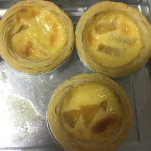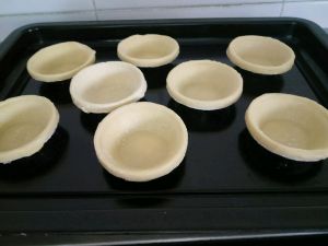 第三步 因为买不到最好的蛋挞模子 我们用酥皮自己做的 外形有点丑 但是味道很好 PS:最好用铝的外模 纸头的太软 撑不起自制的酥皮