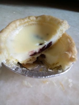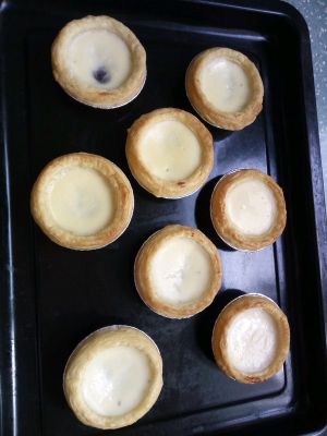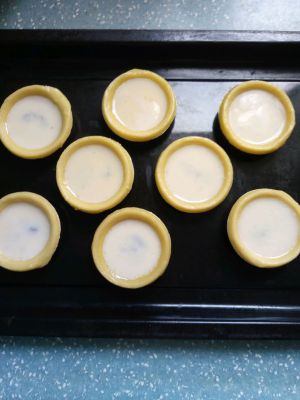 蛋液倒入蛋挞里7成满。放蓝莓 。