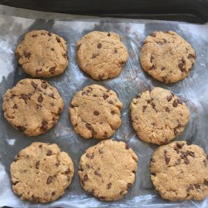 烤箱预热170度,烤盘铺好油纸,用大勺子挖一勺面糊放入烤盘,用双手压扁成圆形