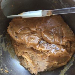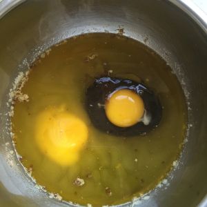 分几次加入打散的鸡蛋液,打成均匀的油蛋糊