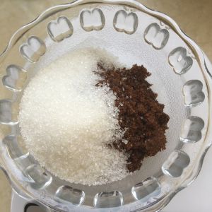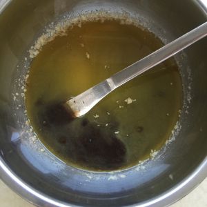 融化的黄油倒入红糖和砂糖碗里搅拌