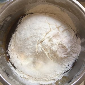 低劲面粉与小苏打混合过筛,倒入黄油里,橡皮刮刀拌匀成饼干面糊。