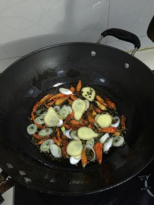 炒料加入蒜蓉、香料、八角、干辣椒等不停翻炒