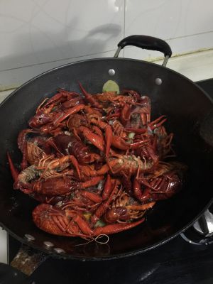 接着把龙虾放进去爆炒,放点老抽上色,待小龙虾颜色全部变红了,最后倒入啤酒烧开,待汤汁还剩一点点时,就说明已经OK了