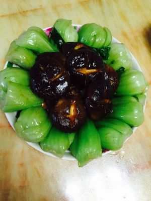 将小油菜洗净,对半切。将香菇去蒂,改十字刀,我也学别人洗净在温水里泡了一会。