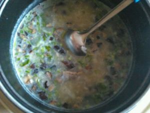米泡好后放入锅里,加入肉丁皮蛋丁和姜块,放少量色拉油和盐,放入大米8倍的水(这是我百度的,实际情况是我随意放的),然后就交给电饭煲了,两小时后香喷喷的皮蛋瘦肉粥就出炉了。